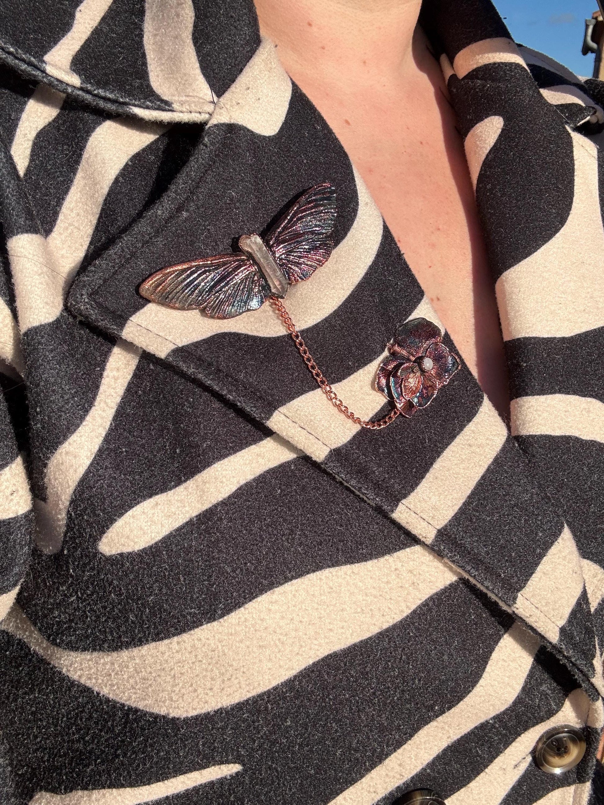 Elegant and quirky brooch for coats and hats, featuring a butterfly and a hydrangea flower, adorned with a rainbow moonstone and a quartz. The brooch is made of copper, resembling a fibula. It consists of a main part with a pin to attach to the fabric, and a decorative jewelry cap at the end of a chain that secures the needle's point."