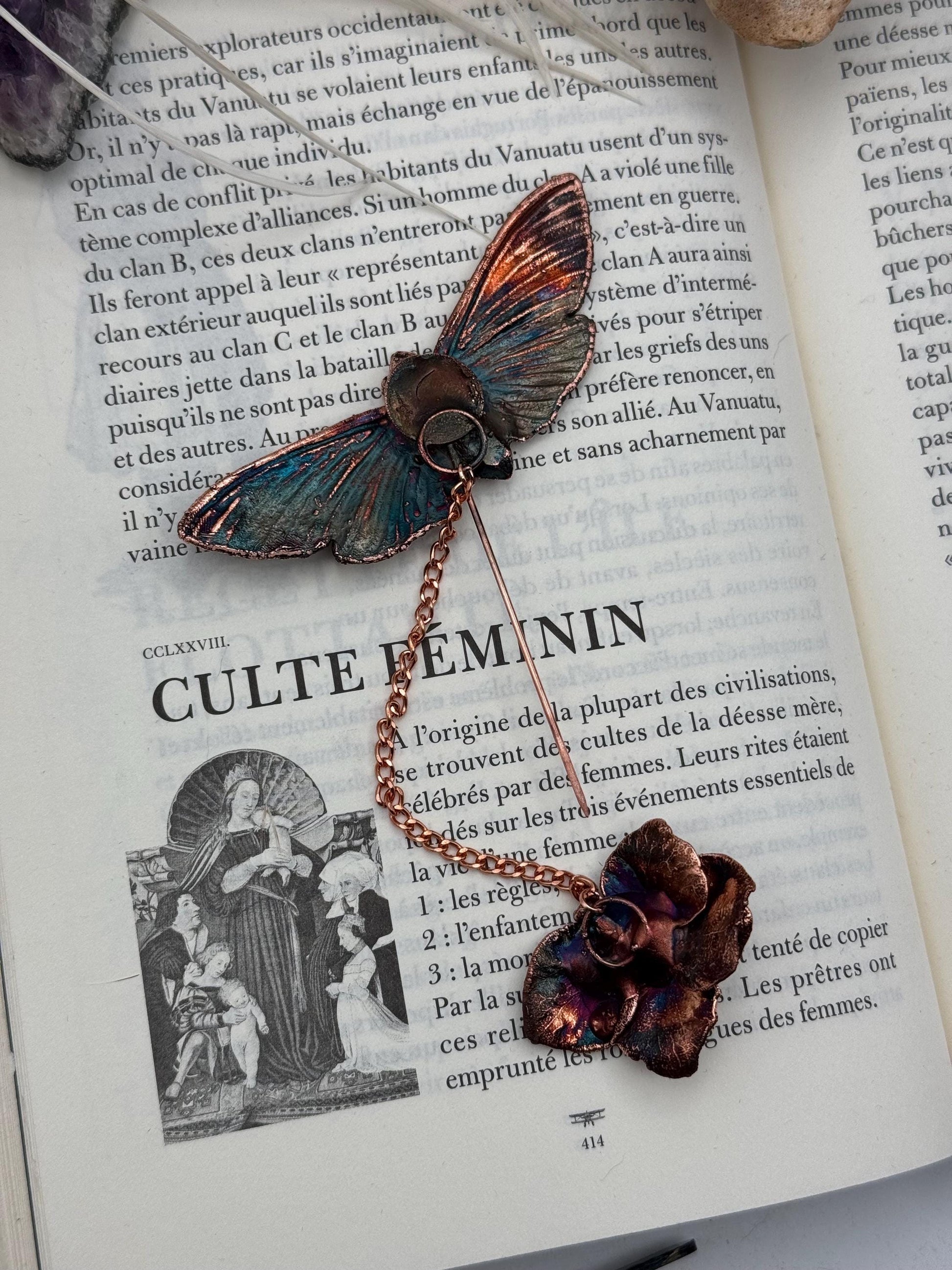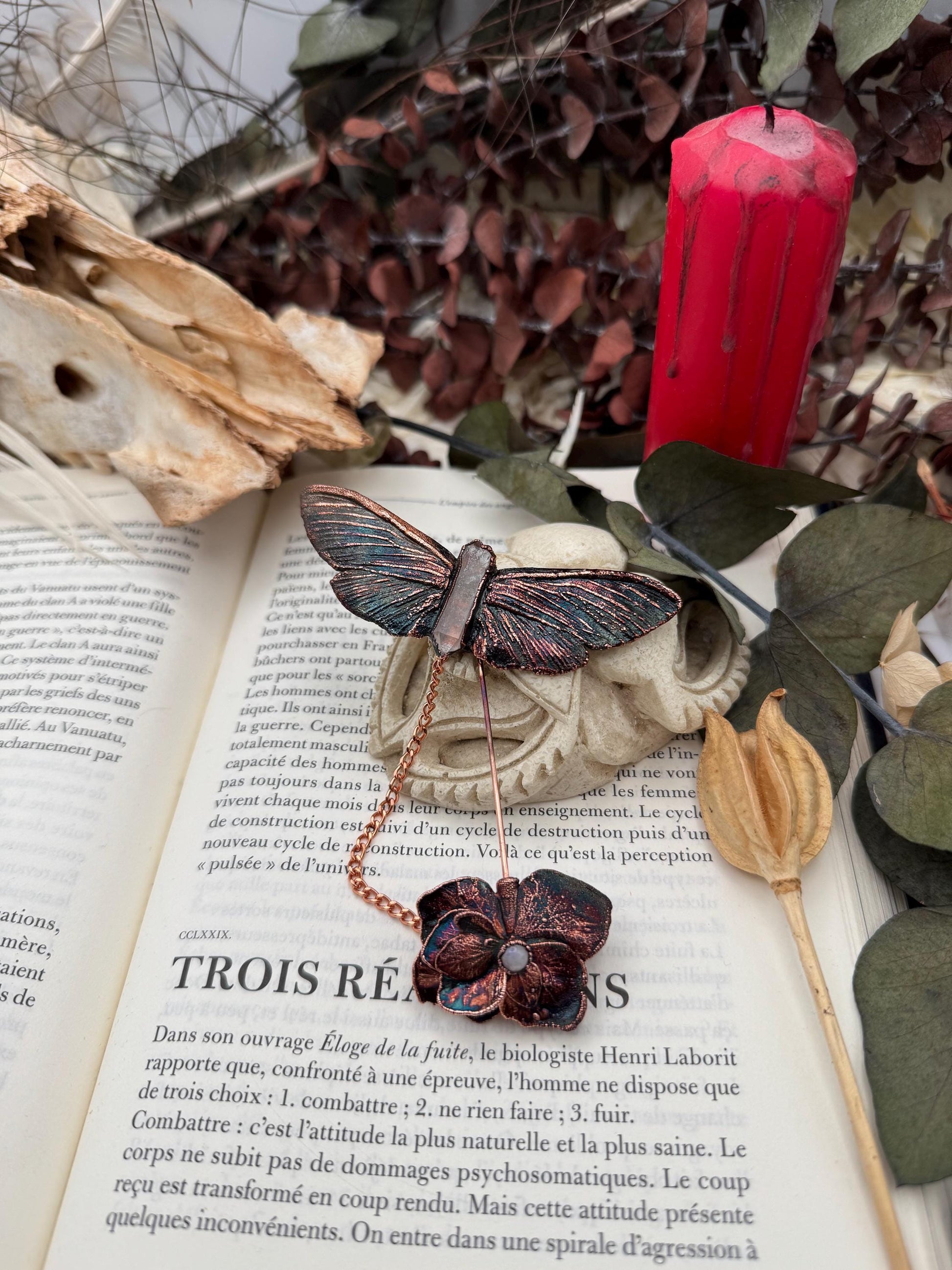 Broche élégante et décalée, pour manteaux et chapeaux, papillon et fleur d’hortensia avec une pointe de quartz et une pierre de lune. Broche en cuivre de type fibule.