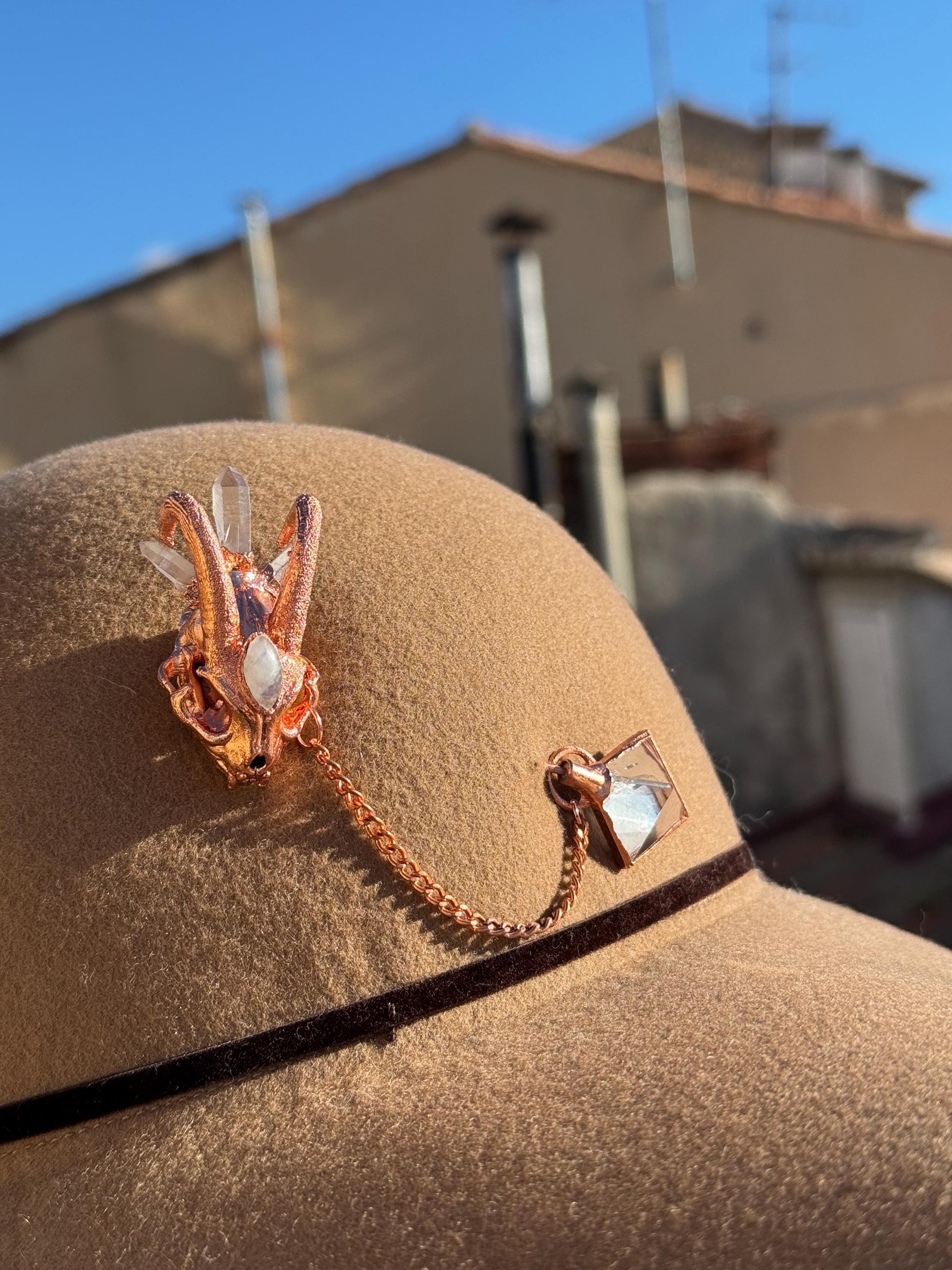 Elegant and quirky brooch for coats and hats, featuring a cat skull with horns, a quartz crown and moonstones. The brooch is made of copper, resembling a fibula. It consists of a main part with a pin to attach to the fabric, and a decorative jewelry cap at the end of a chain that secures the needle's point."