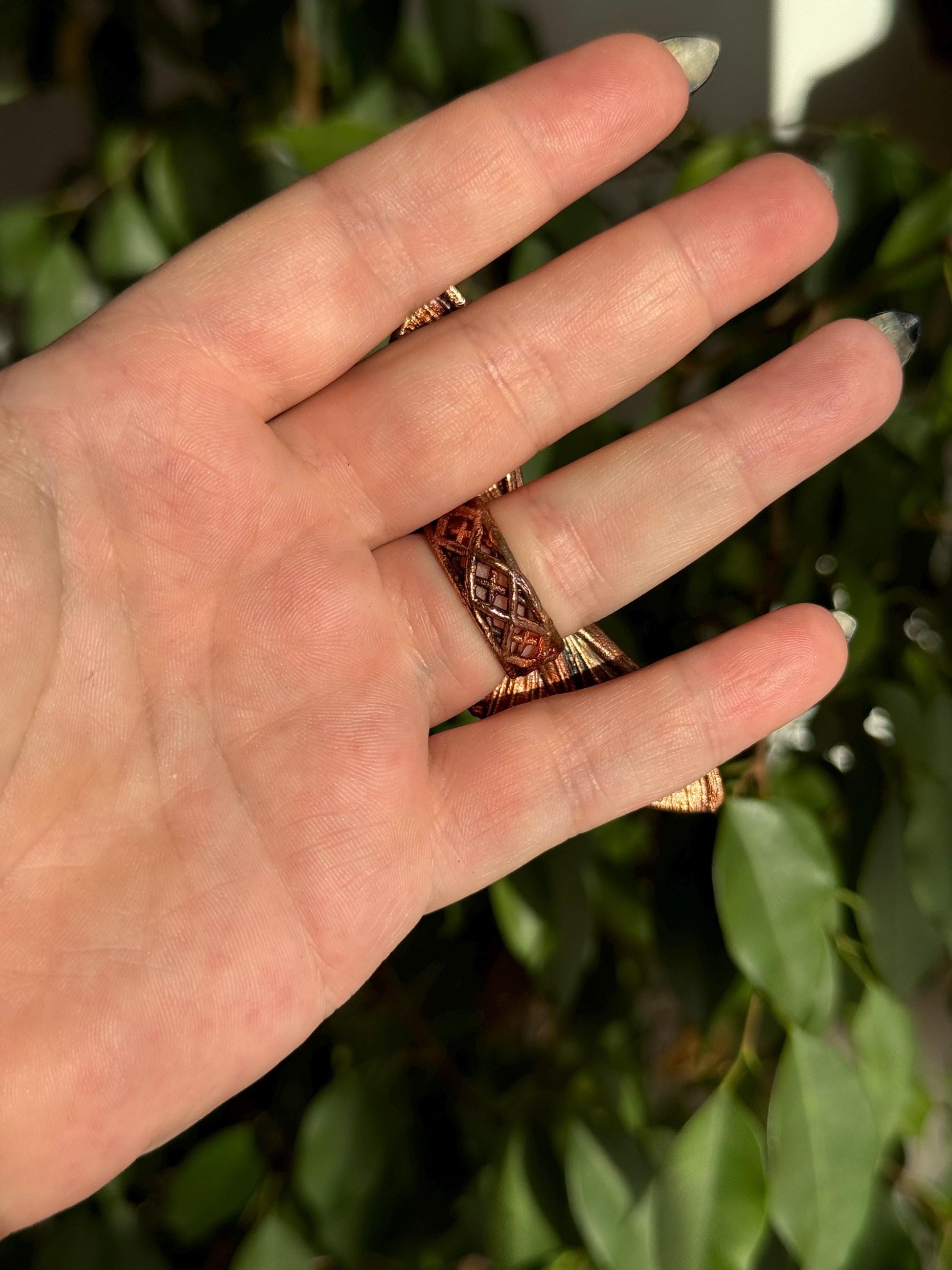 The jewelry is then patinated to give it these antique tones, then sanded and coated with a protective layer of Protectaclear varnish to minimize the natural color changes of the copper and permanently retain the beautiful patina.