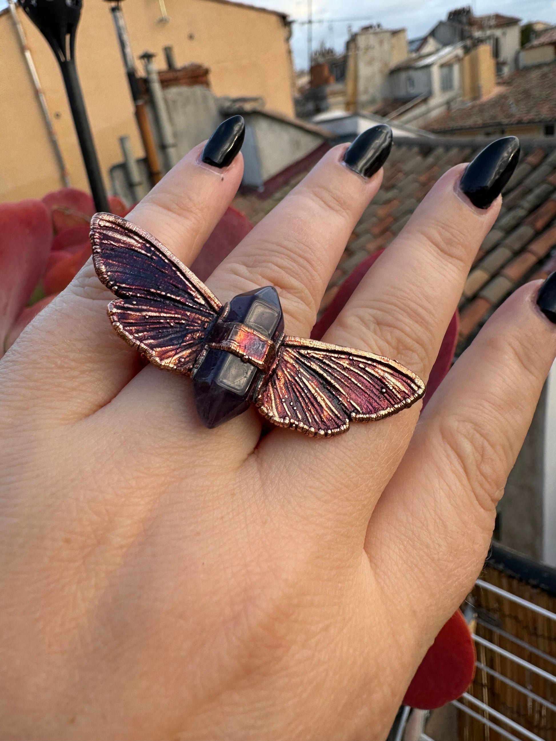 Butterfly ring with an amethyst point size 8.5 US/uk R, copper eformed with colorful patina