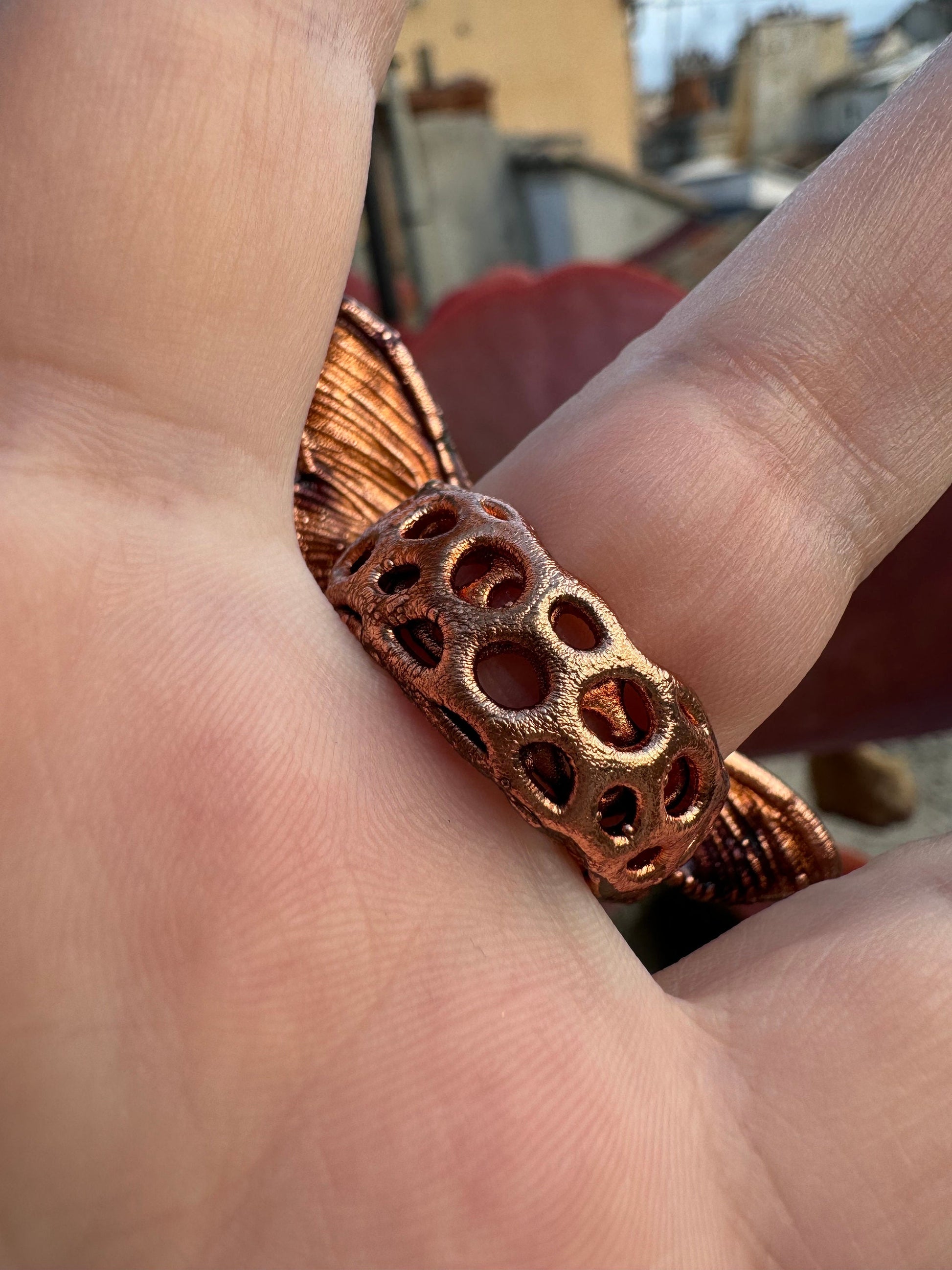 The technique used to make this unique piece is called electro forming or eforming. It is a process of creating jewelry by sculpting a structure with stones, bones, organics and epoxy and then use a system of copper forming by immersion in a bath in which a current flows and causes copper to grow, atom by atom, on the conductive parts of the jewelry.