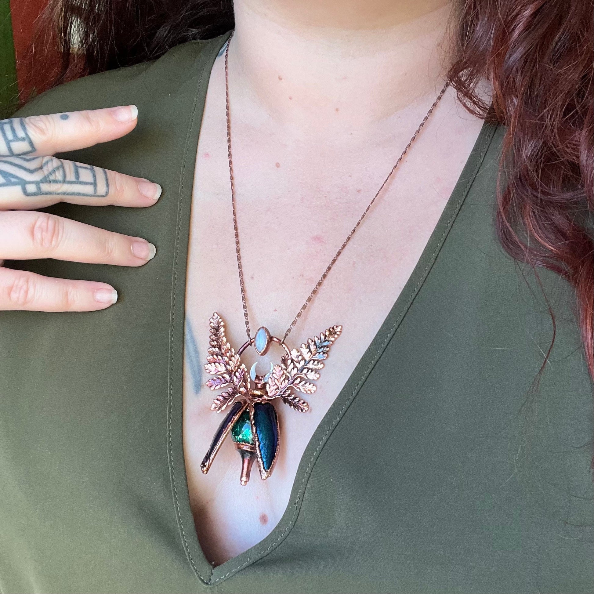 Chimera vial necklace with glittery green water, Copper eformed real beetle elytras with ferns wings, a rainbow moonstone and a white moon