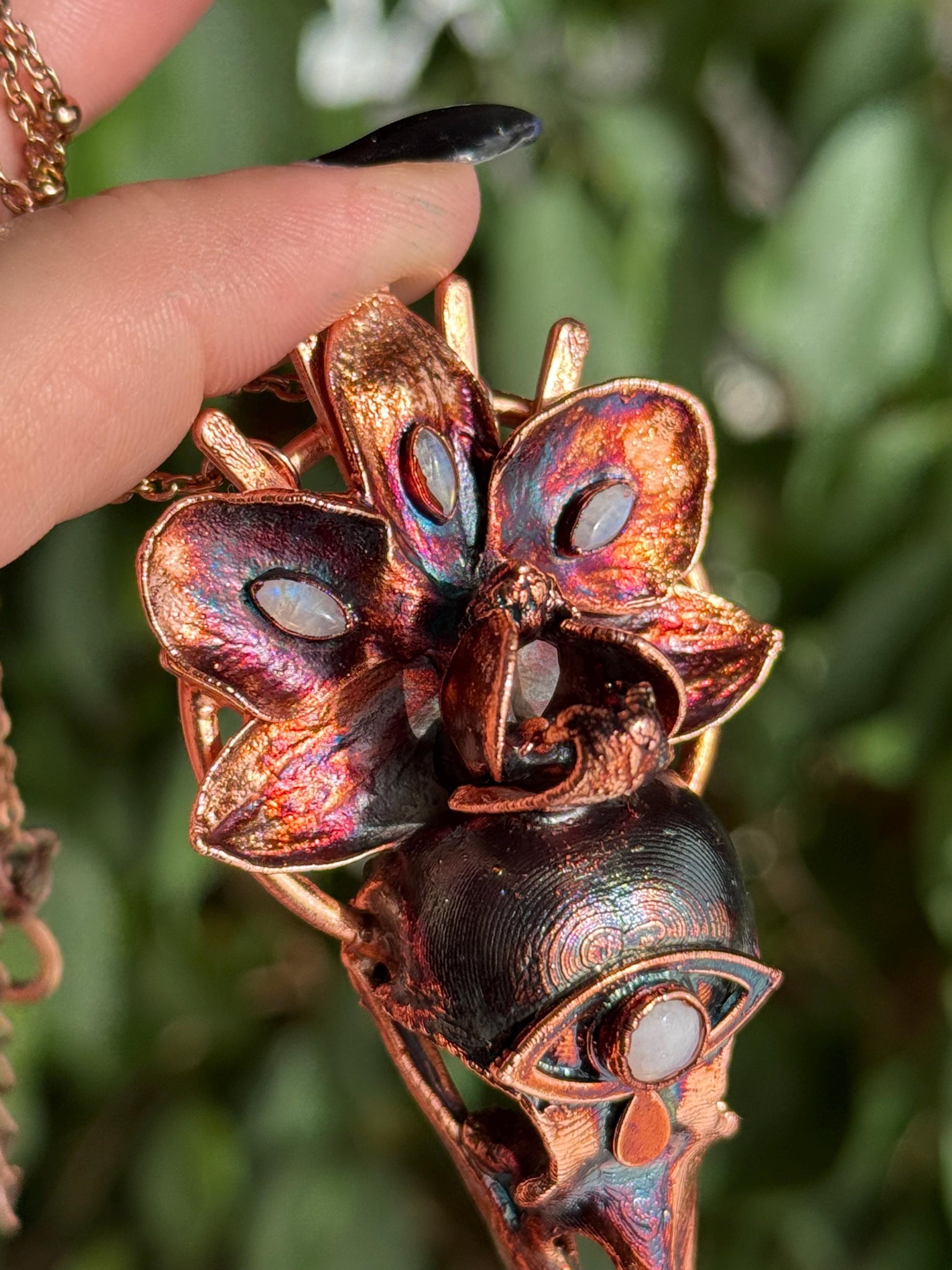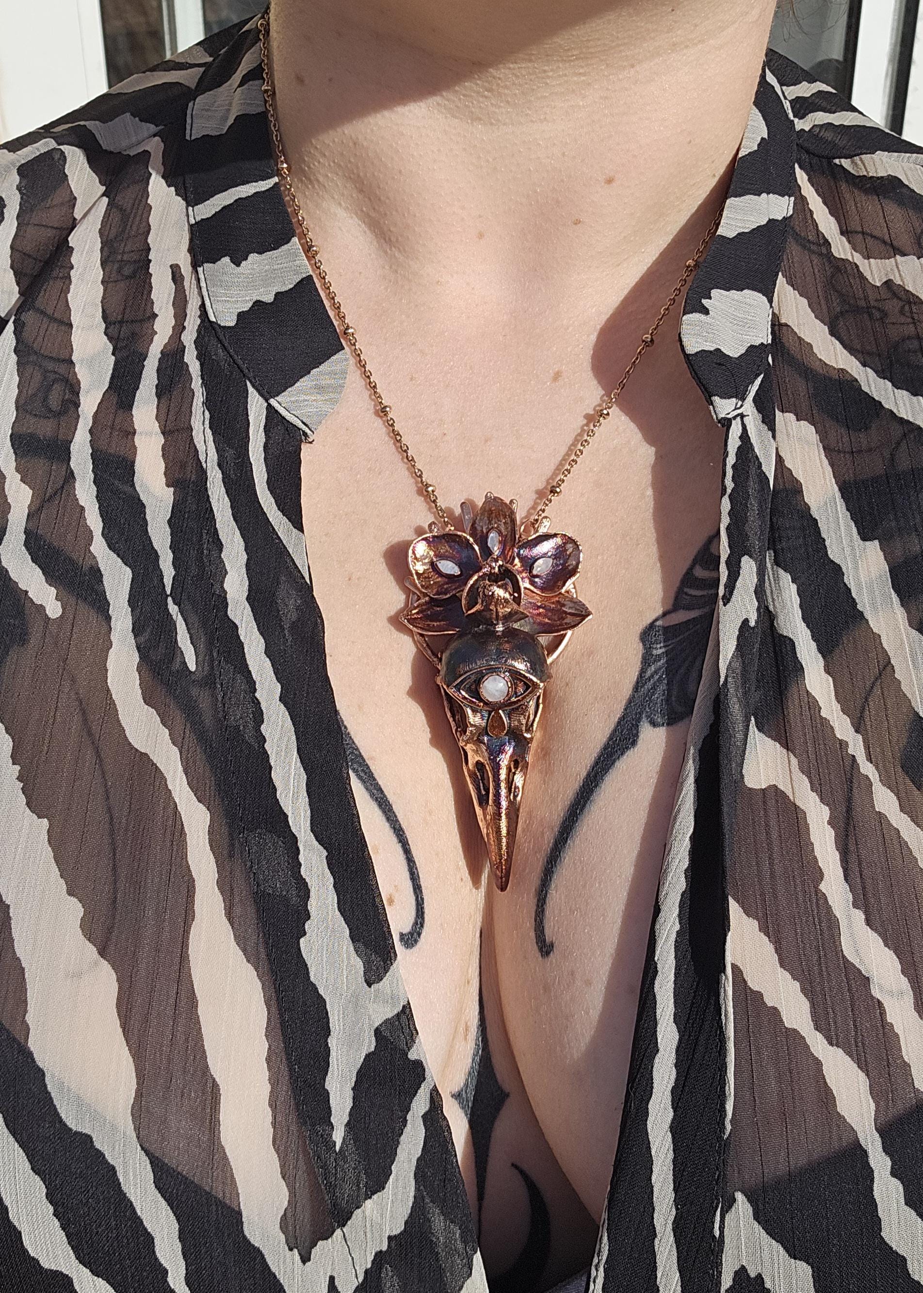 Copper eformed resin raven skull with a real orchid, with rainbow moonstones and a crying third eye.