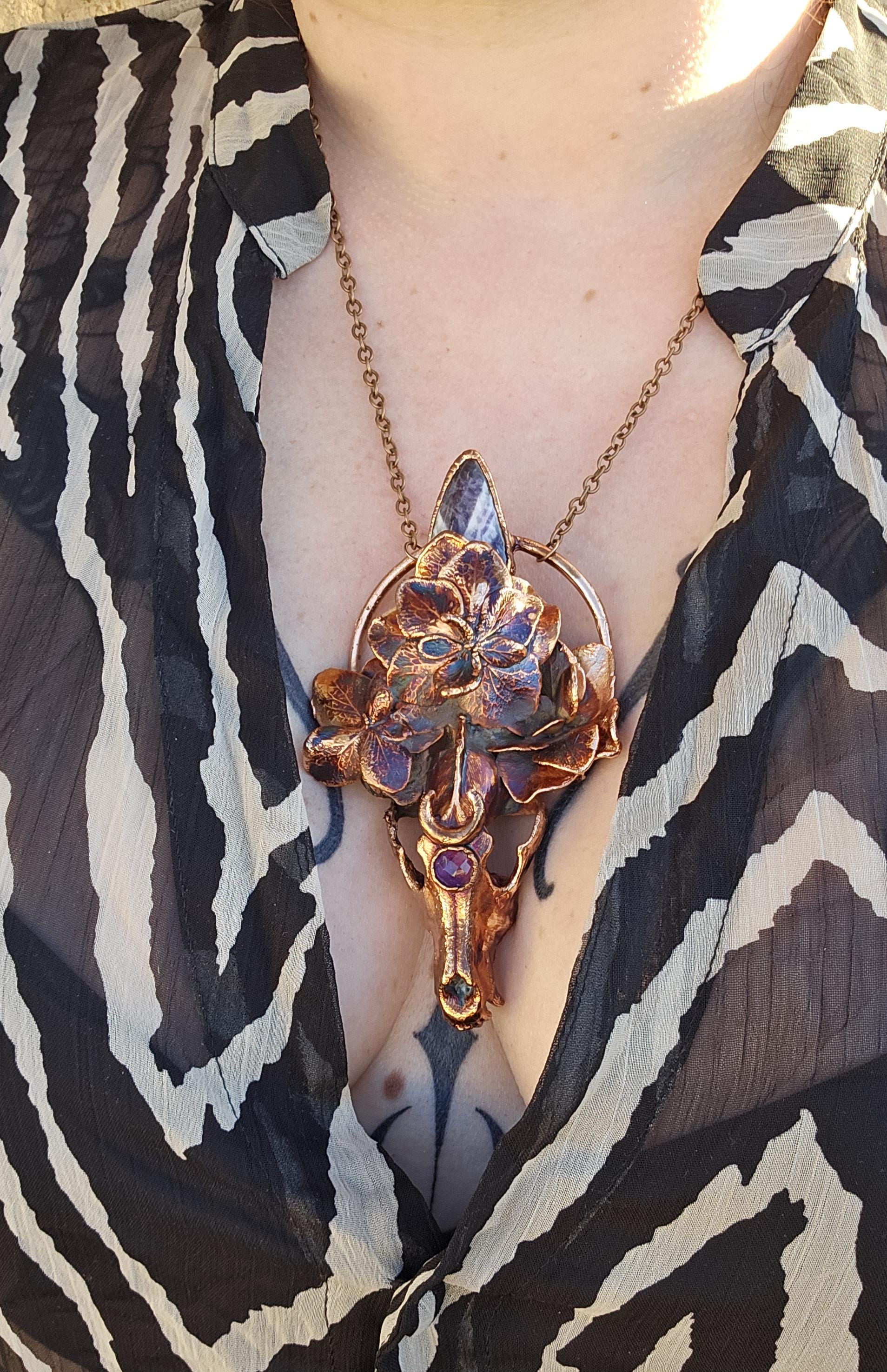 Copper eformed resin wolf skull with a real hydrangeas crown , featuring amethysts, colorfull patina, statement big necklace
