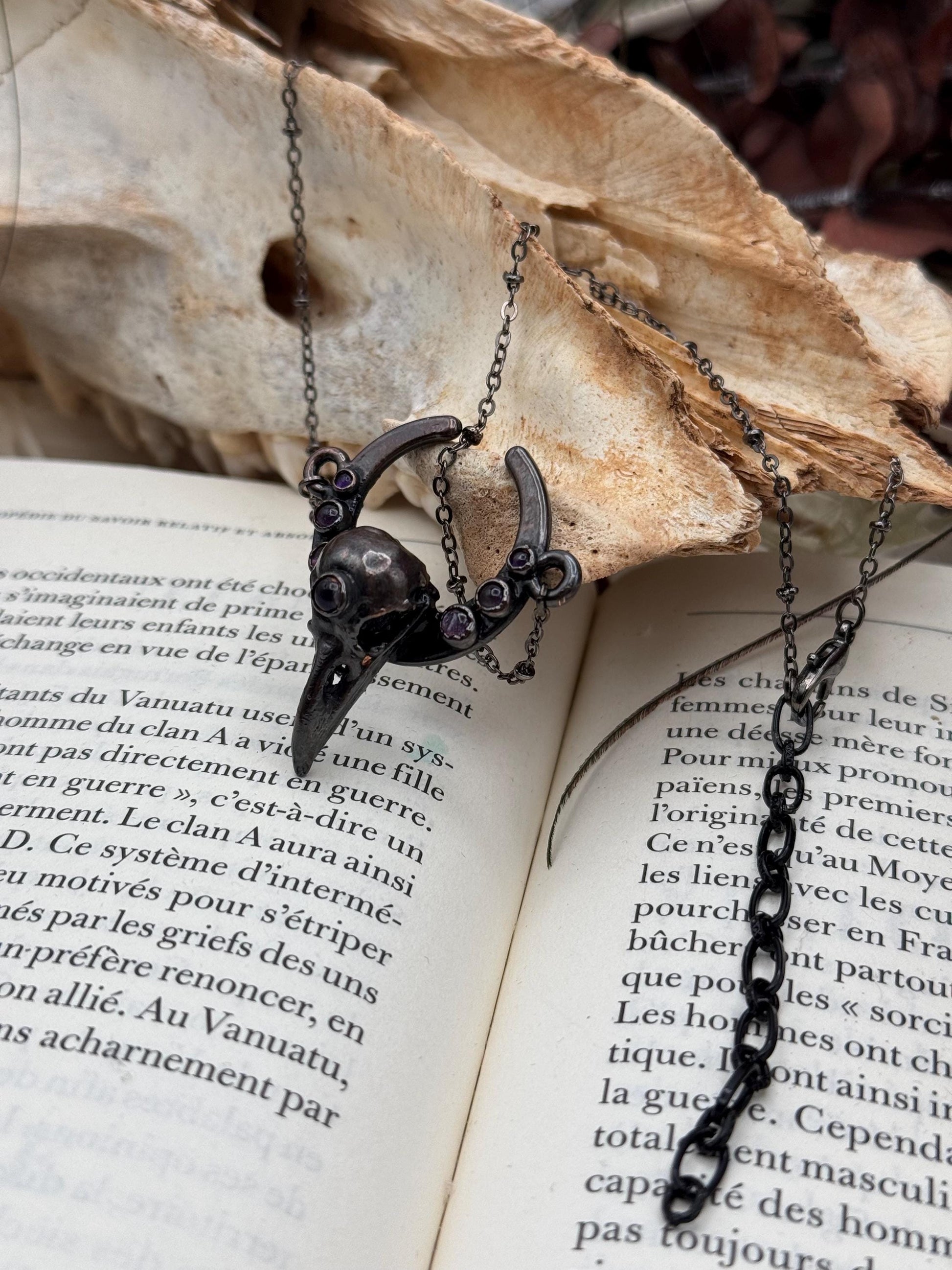 Goth Copper eformed 3d printed raven skull gunblack finish with amethysts on a moon frame, resin vegan skull on a short chain