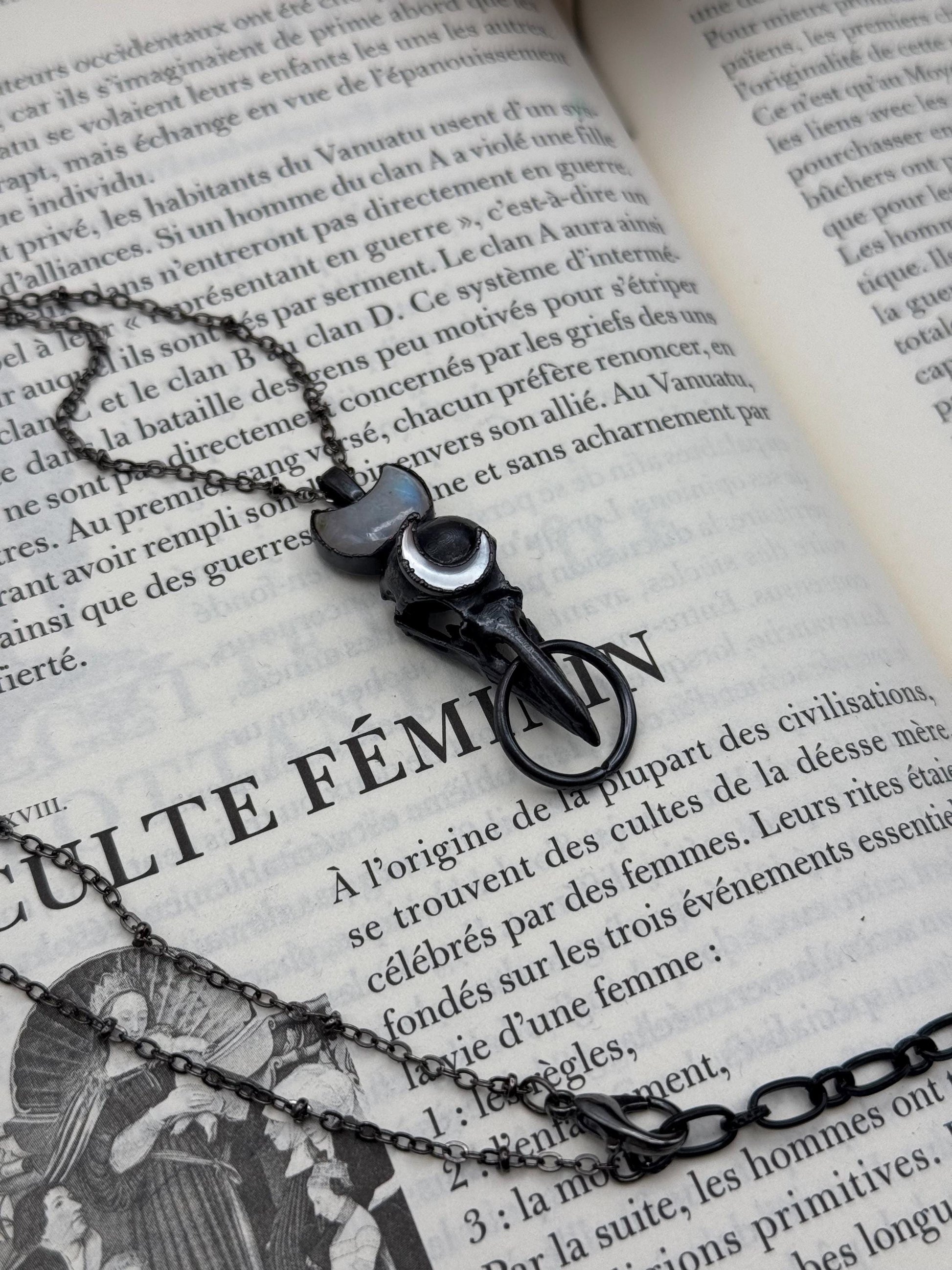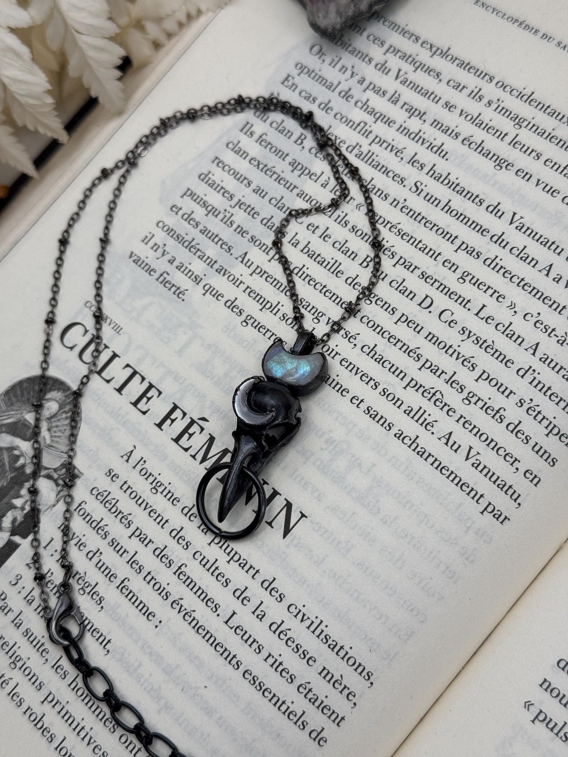 Small resin raven skull eformed in copper with moonstones. Black patina, sealed to preserve the colors, unique witch necklace.