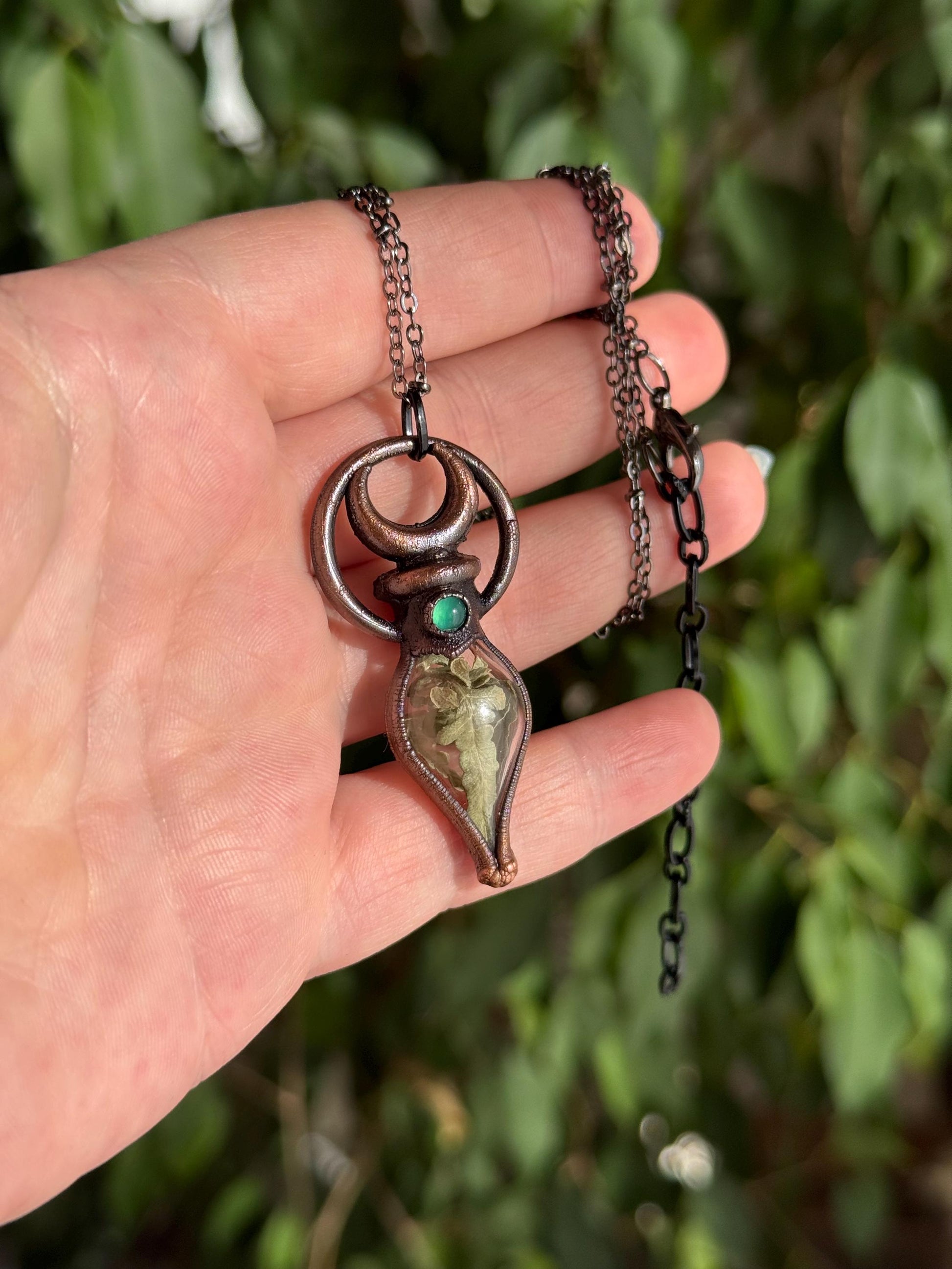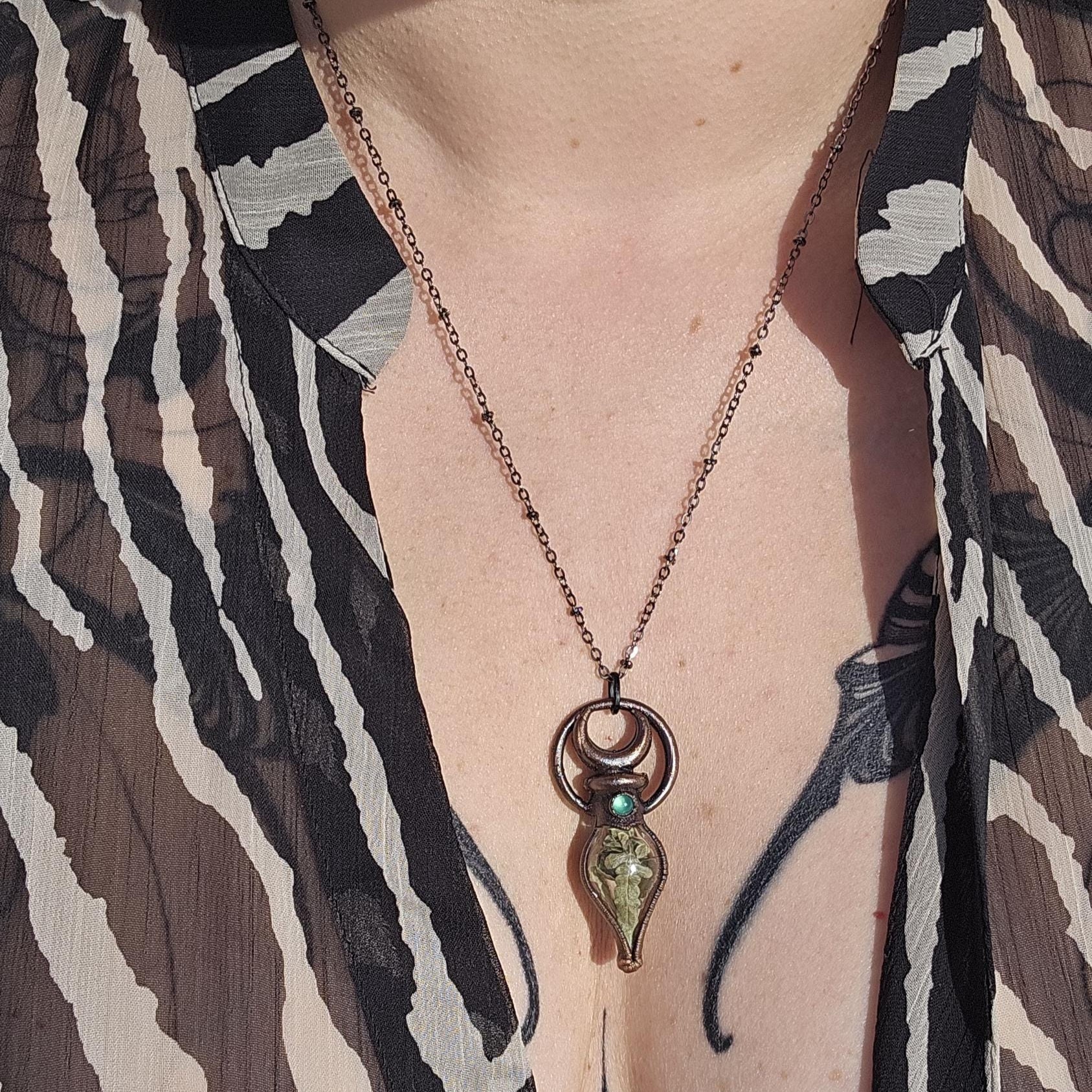 Simple vial filled with fern, Copper eformed necklace with dark finish adorned with green onix . The vial is made of glass, dont drop it accidentally it could break, you need to be carefull with your magic vial !